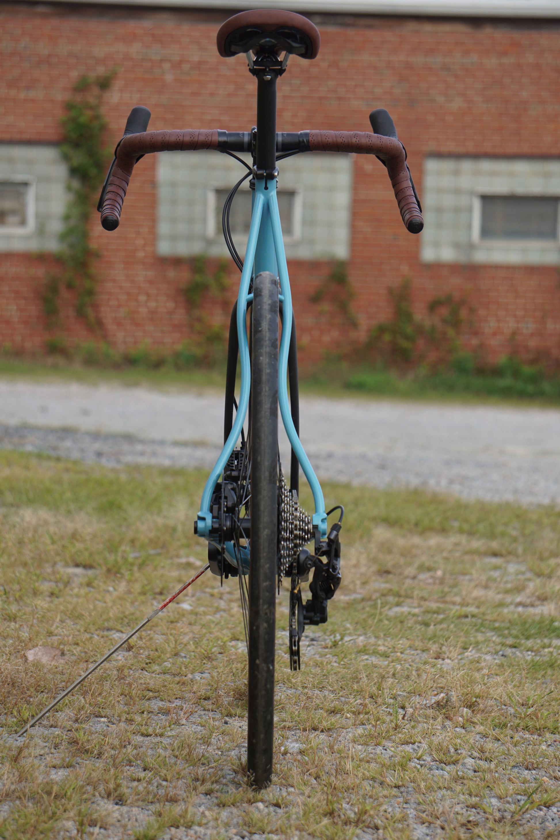 We built this to show off at the Philly Bike Expo this year - and have shown it off all over this summer - but it's brand new and never ridden. The finish is pristine, with brushed brass downtube and headtube badges shining through a high-gloss sky blue powder coat.