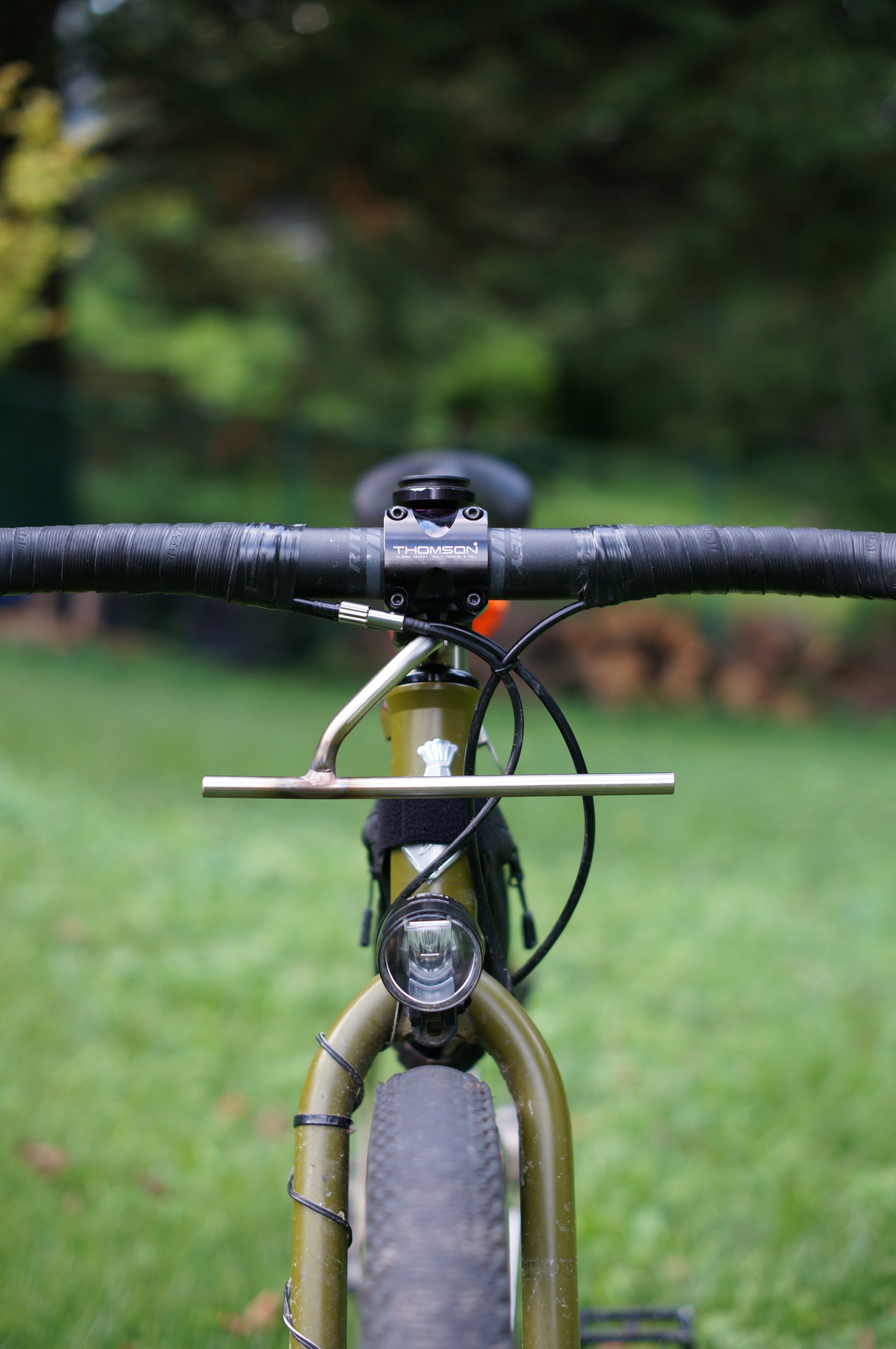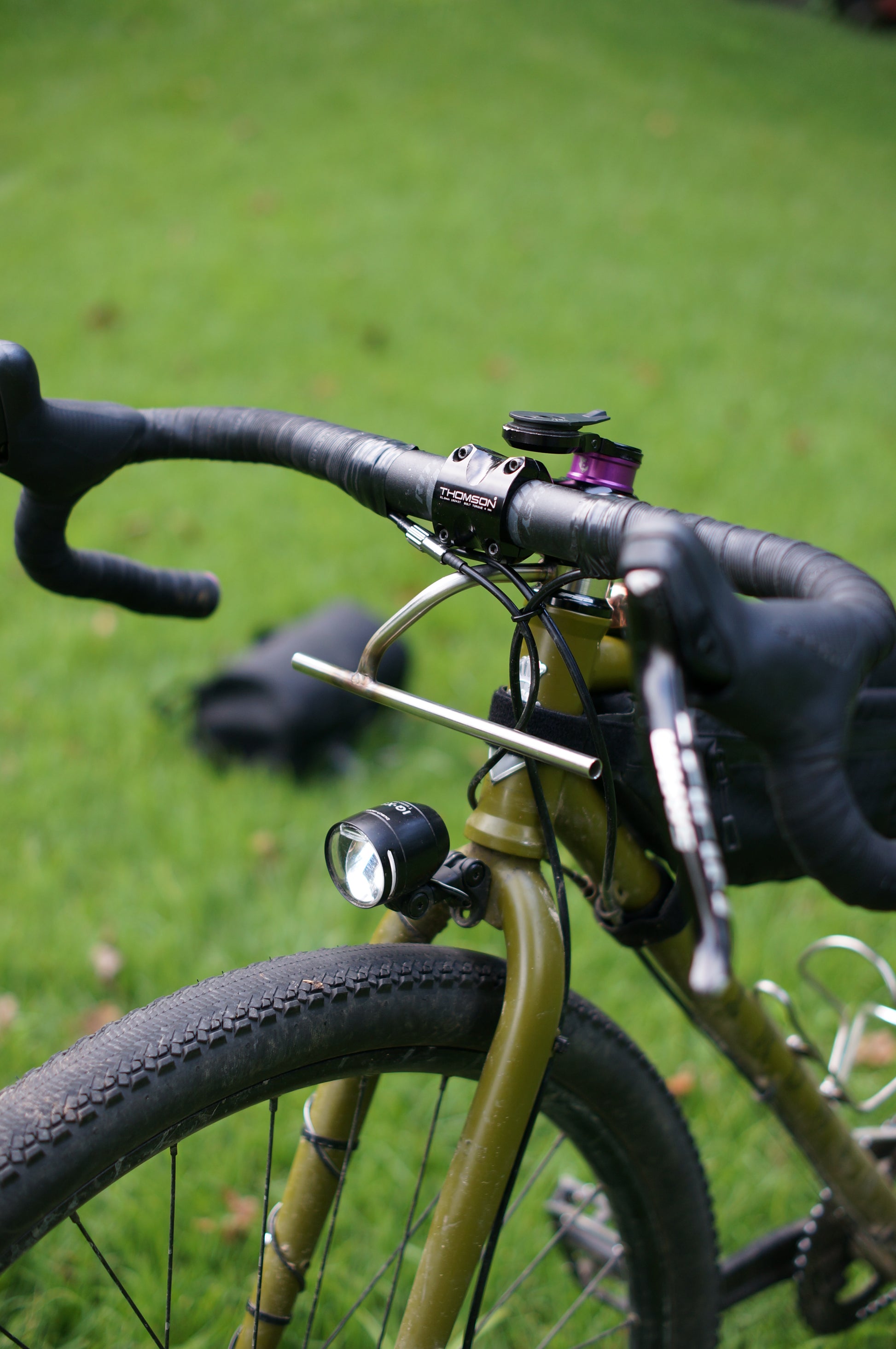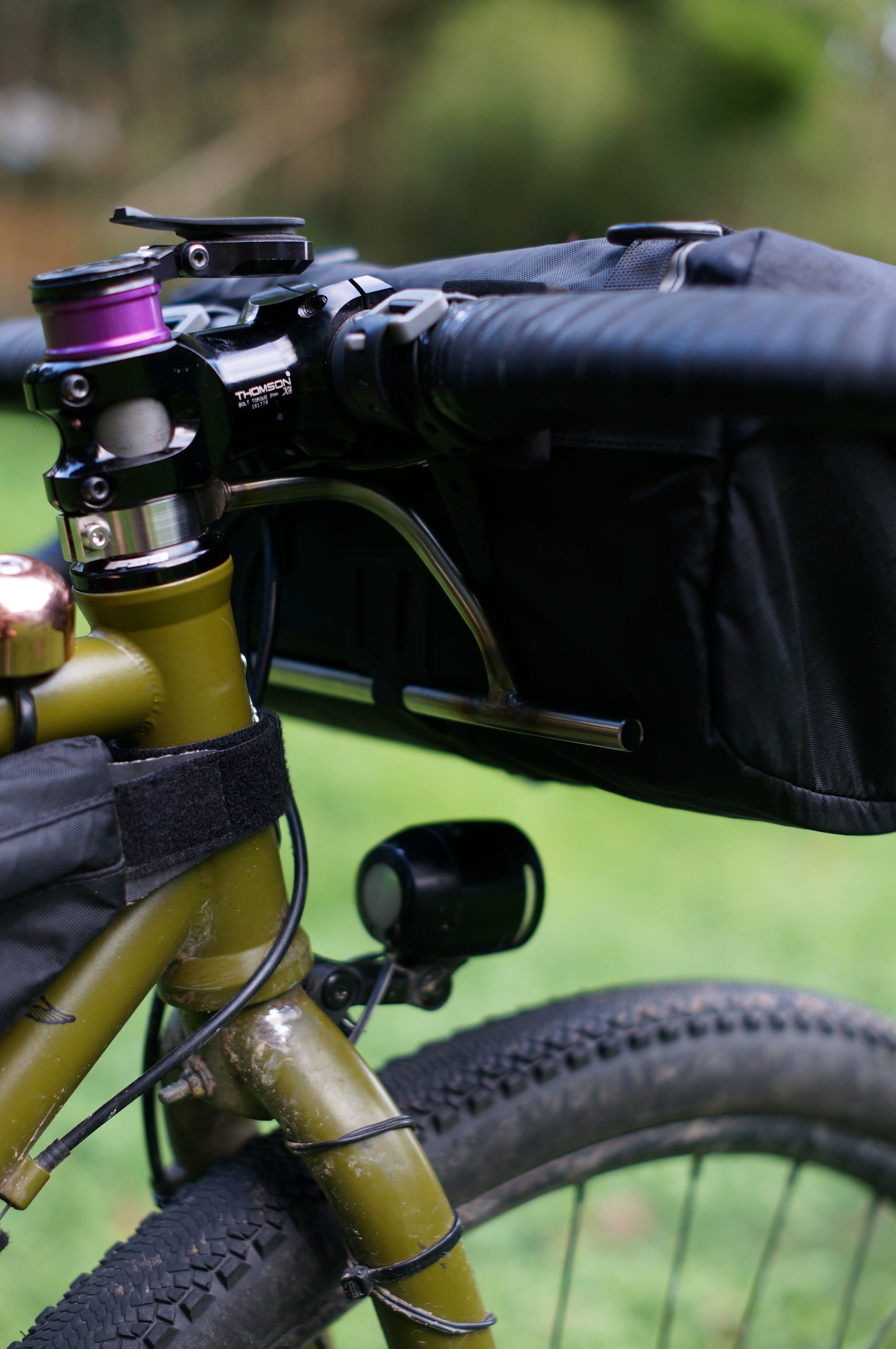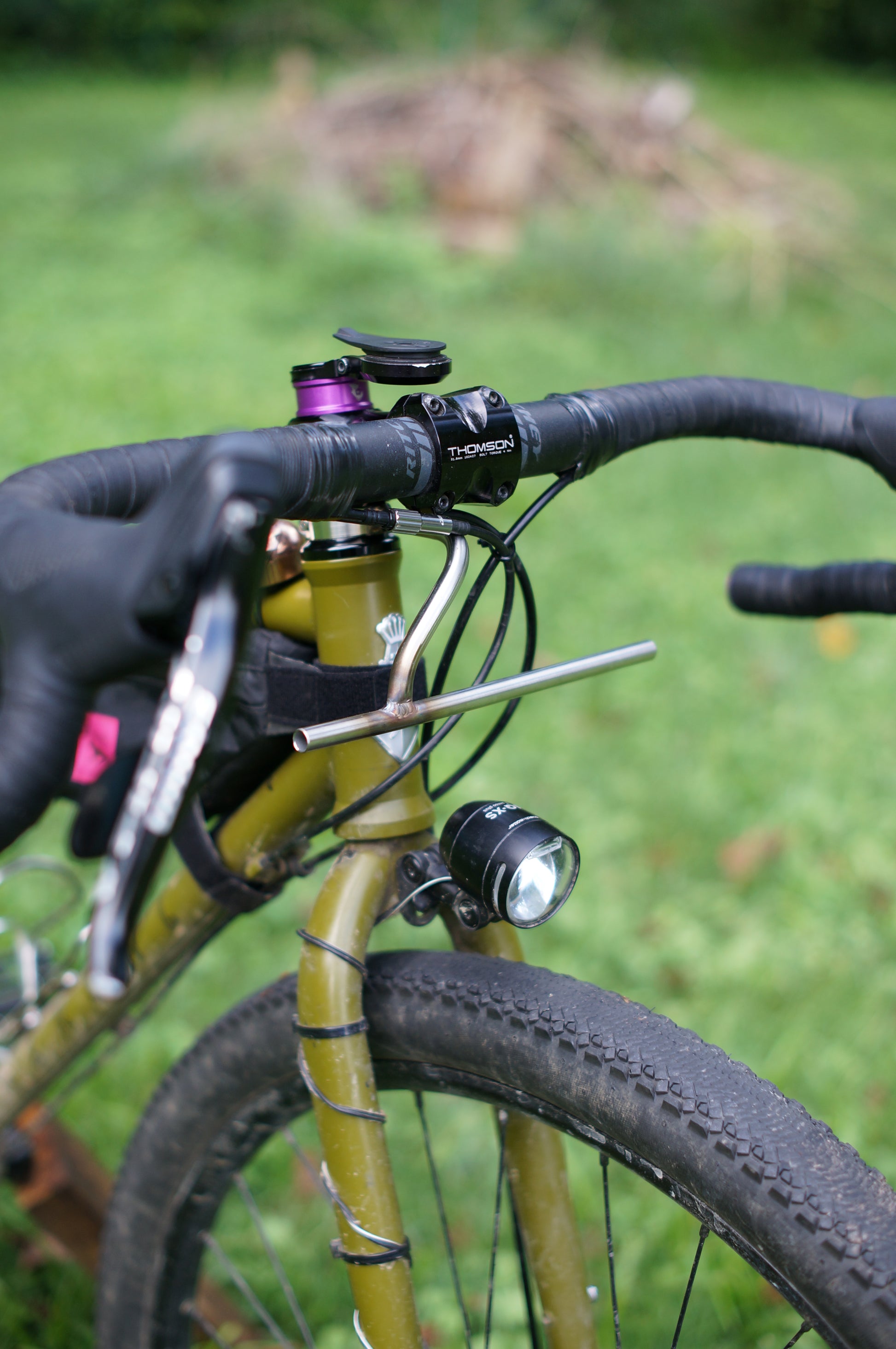 Tuck a headlight under your bag! Threaded M6 and M5 mounting holes for Dynamo lights and handlebar light adapters like the Paul Gino.